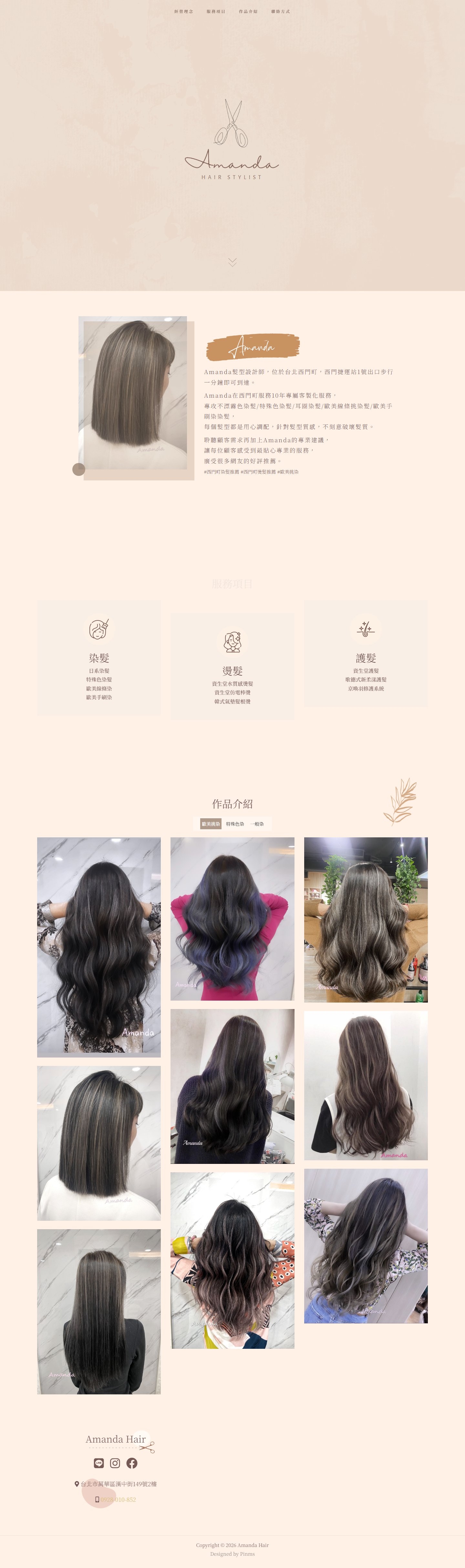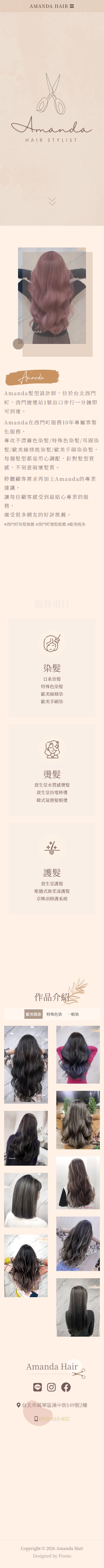 網站類型:一頁式形象網站 客戶名稱:台北西門町染髮推薦-Amanda髮型設計師 技術架構:RWD, HTML, CSS, JavaScript 網站網址:https://pinms.com.tw/amanda-hair 本作品為「台北西門町染髮推薦-Amanda髮型設計師」量身打造的一頁式形象網站,以單頁捲動方式呈現品牌形象與服務內容,搭配流暢的動態效果與響應式排版,提供良好的使用者體驗。 產業類別:已發布