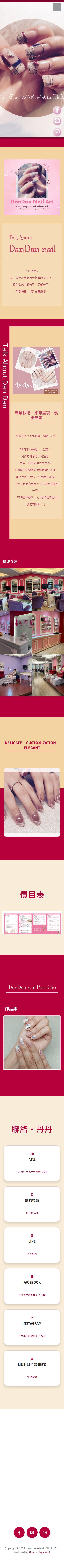 網站類型:一頁式形象網站 客戶名稱:士林美甲店推薦-丹丹指藝 技術架構:RWD, HTML, CSS, JavaScript 網站網址:https://pinms.com.tw/dandan-nail 本作品為「士林美甲店推薦-丹丹指藝」量身打造的一頁式形象網站,以單頁捲動方式呈現品牌形象與服務內容,搭配流暢的動態效果與響應式排版,提供良好的使用者體驗。 產業類別:已發布