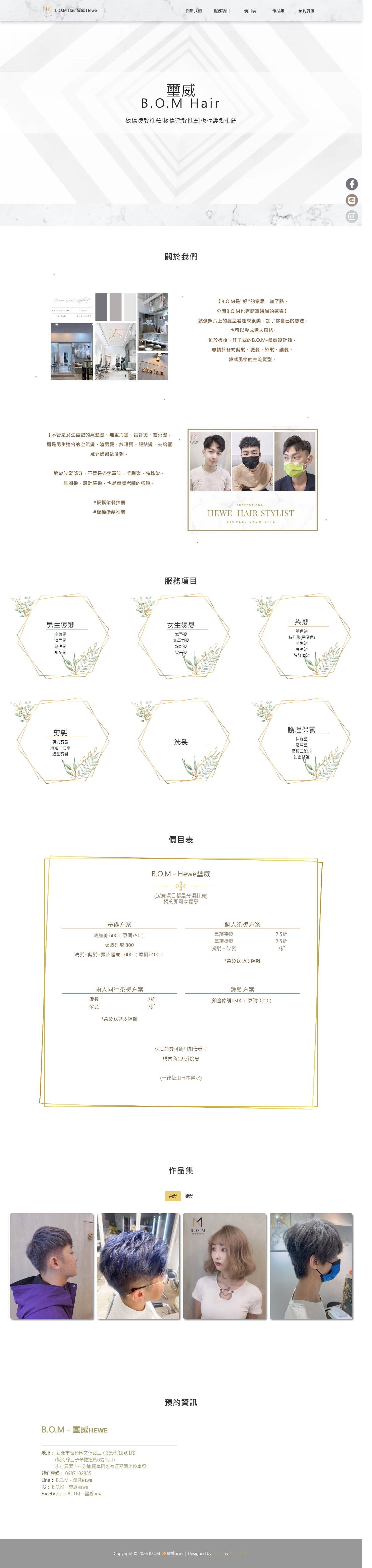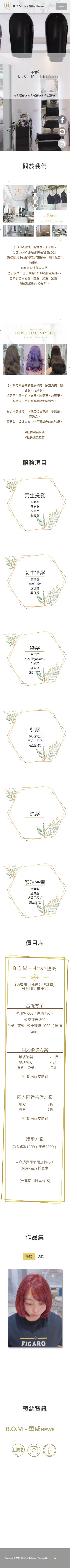 網站類型:一頁式形象網站 客戶名稱:板橋美髮推薦B.O.M Hair 璽威 Hewe 技術架構:RWD, HTML, CSS, JavaScript 網站網址:https://pinms.com.tw/hewe 本作品為「板橋美髮推薦B.O.M Hair 璽威 Hewe」量身打造的一頁式形象網站,以單頁捲動方式呈現品牌形象與服務內容,搭配流暢的動態效果與響應式排版,提供良好的使用者體驗。 產業類別:已發布