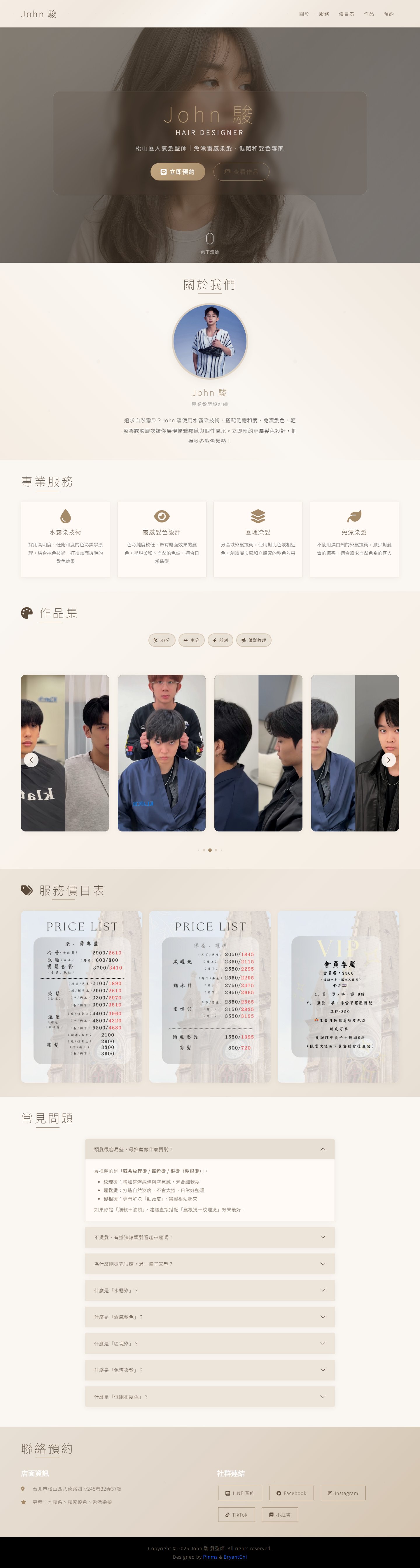 網站類型:一頁式形象網站 客戶名稱:立即預約 John 駿 技術架構:RWD, HTML, CSS, JavaScript 網站網址:https://pinms.com.tw/john-hair 本作品為「立即預約 John 駿」量身打造的一頁式形象網站,以單頁捲動方式呈現品牌形象與服務內容,搭配流暢的動態效果與響應式排版,提供良好的使用者體驗。 產業類別:已發布