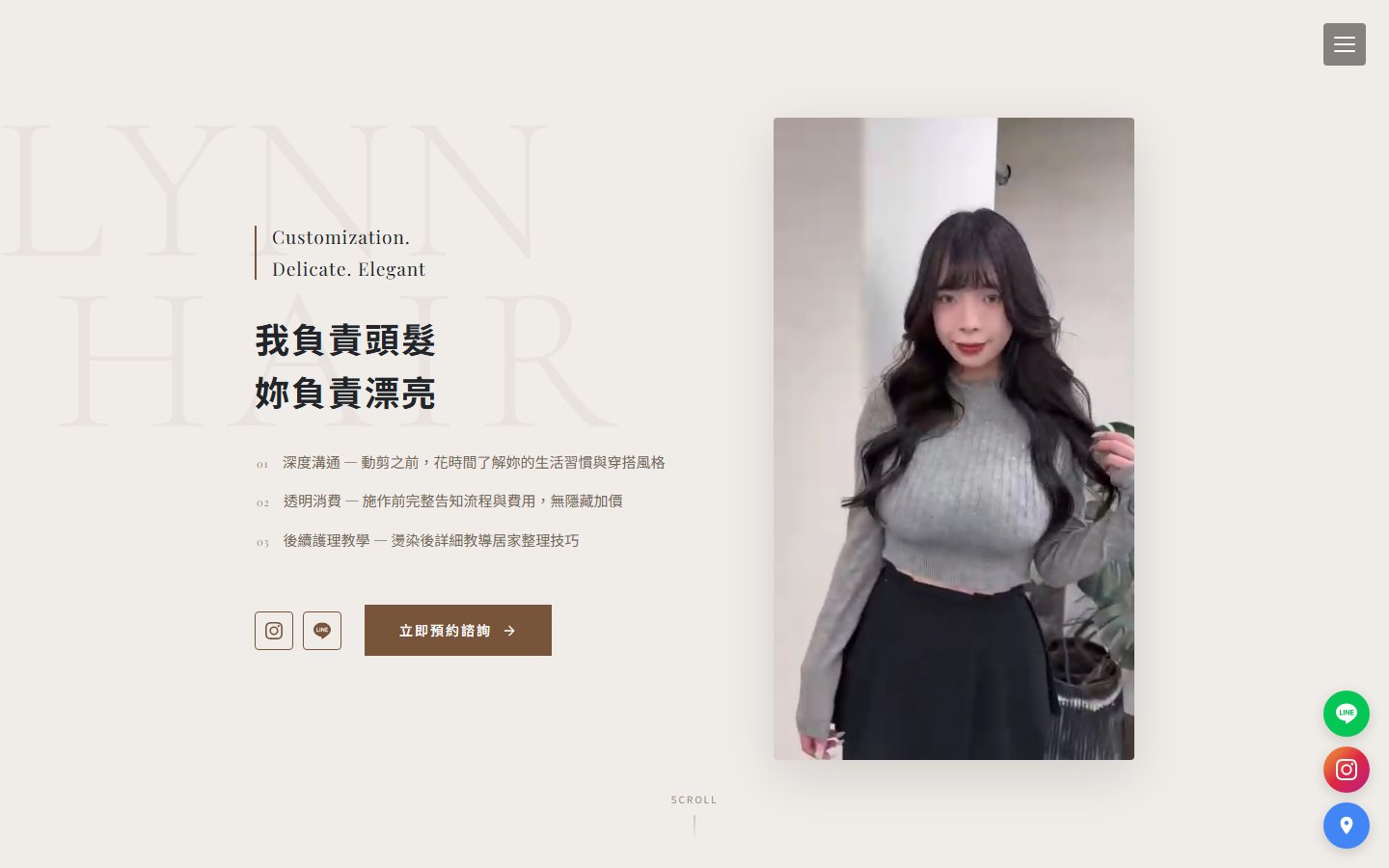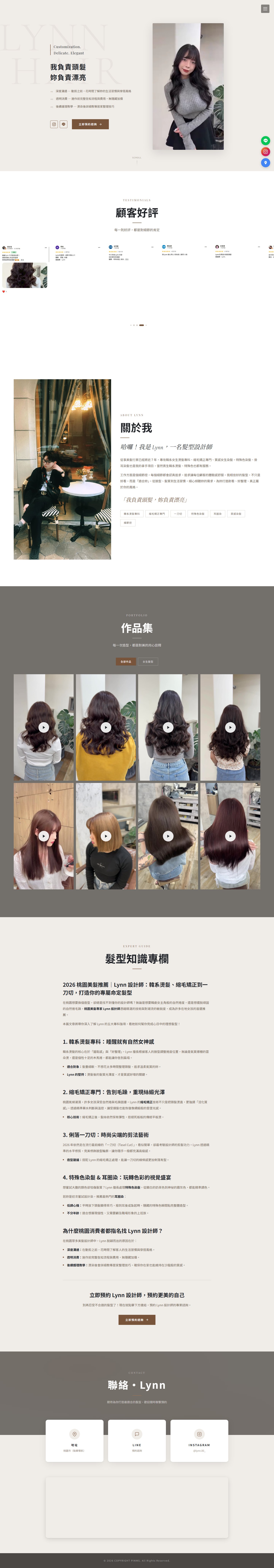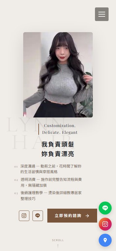 網站類型:一頁式形象網站 客戶名稱:𝓛𝔂𝓷𝓷 技術架構:RWD, HTML, CSS, JavaScript 網站網址:https://pinms.com.tw/lynn-hair 本作品為「𝓛𝔂𝓷𝓷」量身打造的一頁式形象網站,以單頁捲動方式呈現品牌形象與服務內容,搭配流暢的動態效果與響應式排版,提供良好的使用者體驗。 產業類別:已發布