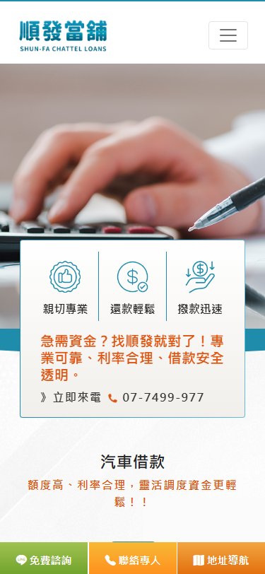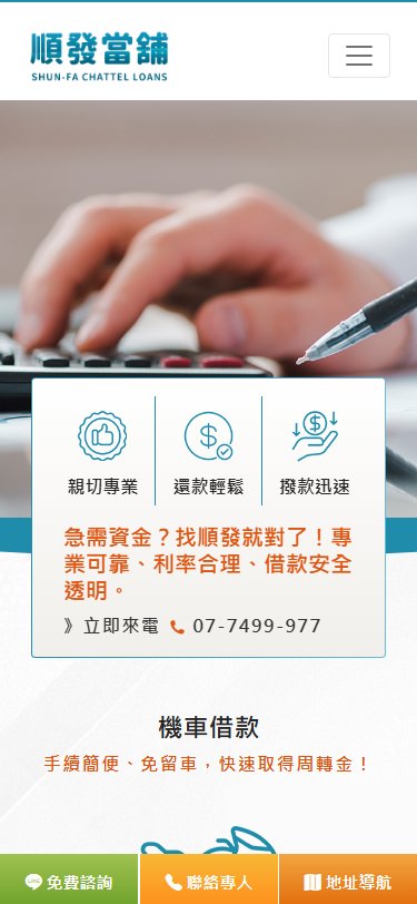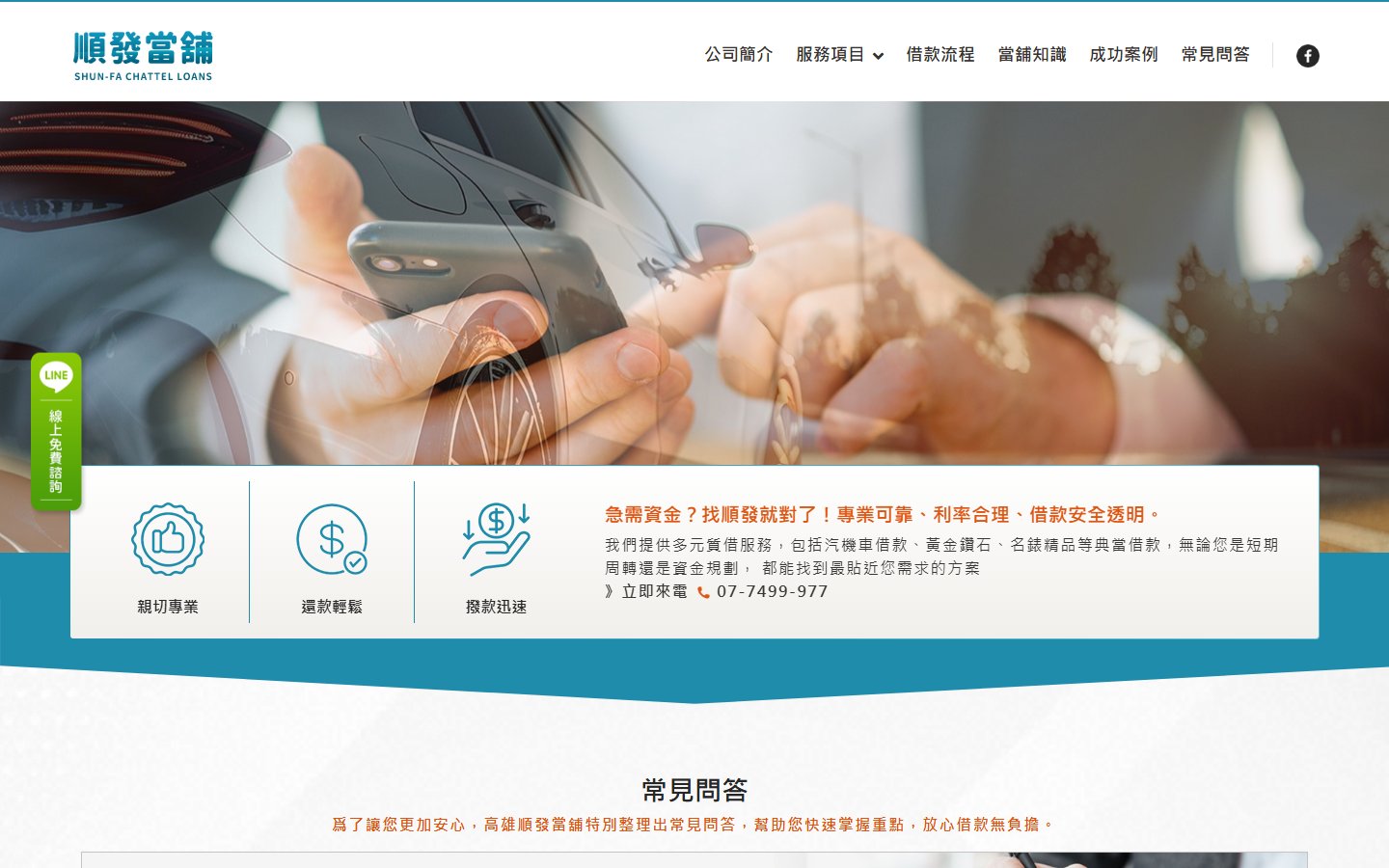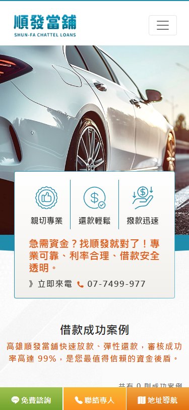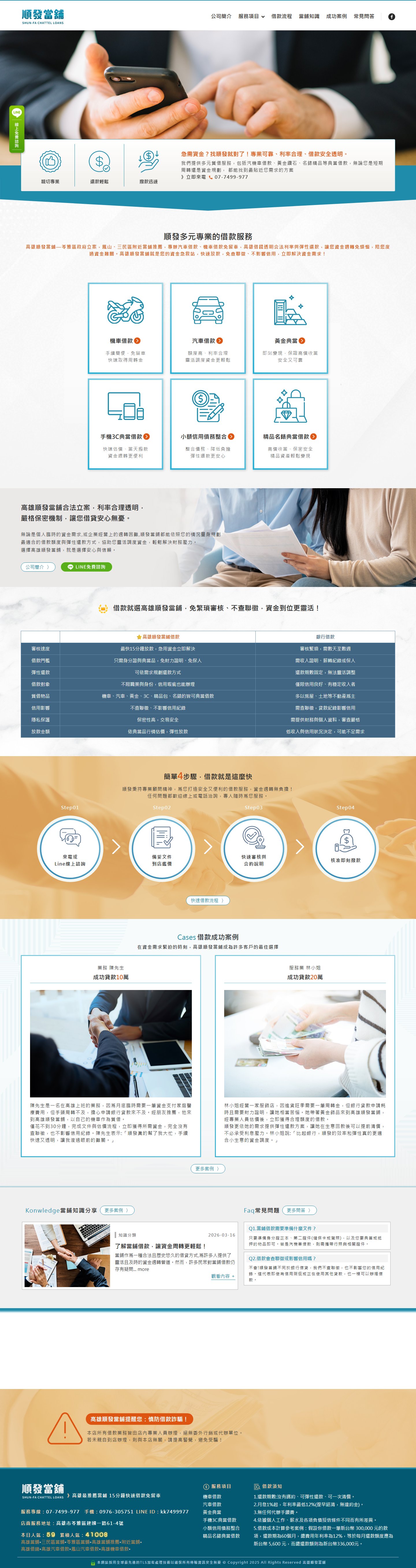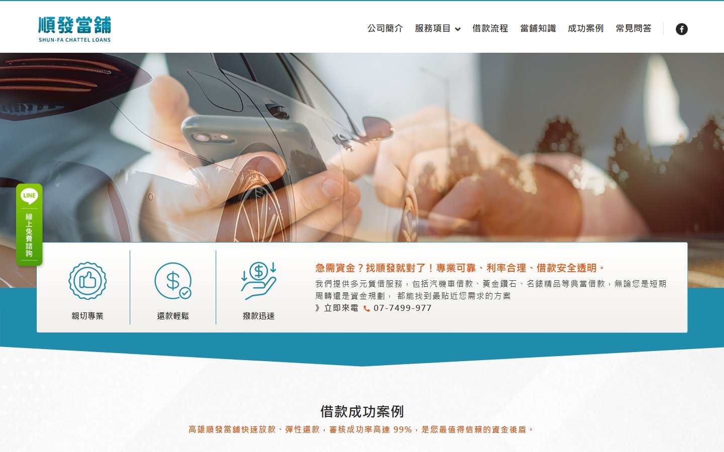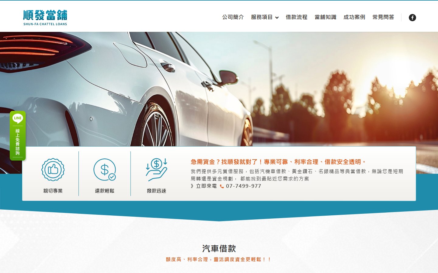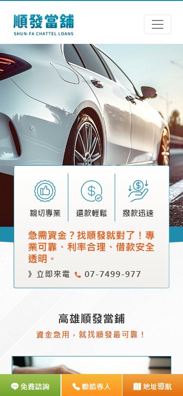專案描述:本專案為順發當舖打造的企業形象官方網站,主要用於展示金融借貸服務內容,包含汽車借款、機車借款與資金周轉等服務介紹。網站採用 Laravel 作為後端框架,搭配 jQuery 與 Bootstrap 建構前端介面,並實作完整的 RWD 響應式設計,使網站在桌面與行動裝置上皆能提供流暢且一致的瀏覽體驗。透過清晰的資訊架構與借款流程說明,協助使用者快速了解服務內容並取得聯絡資訊。