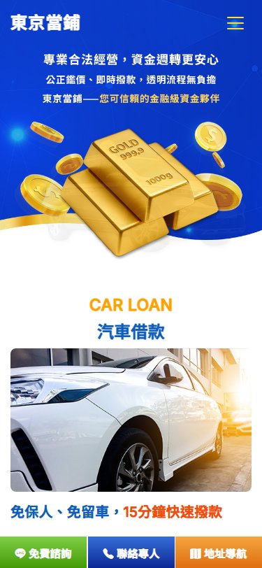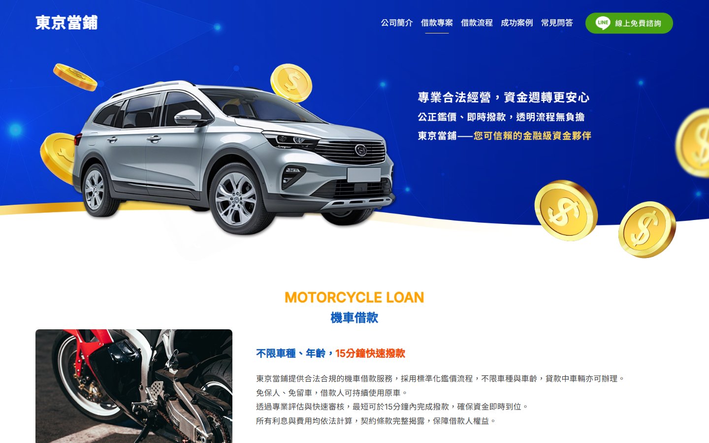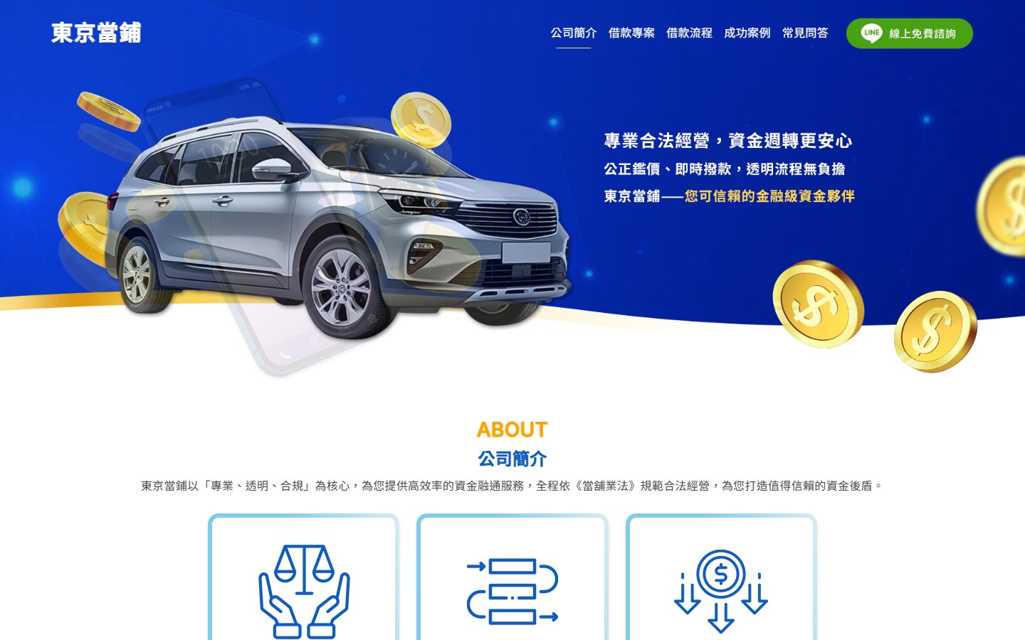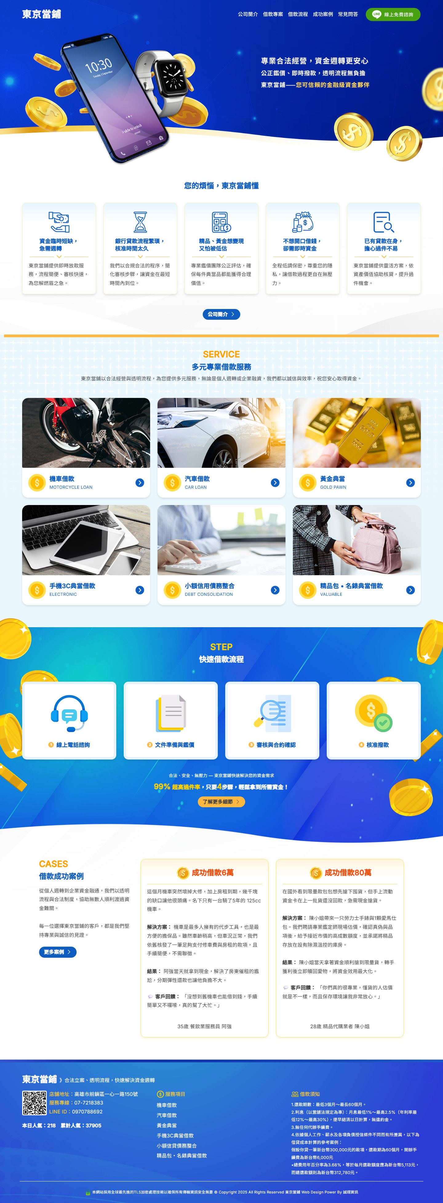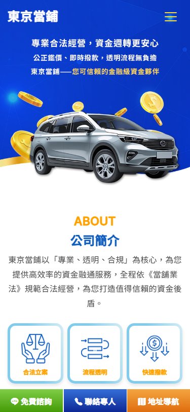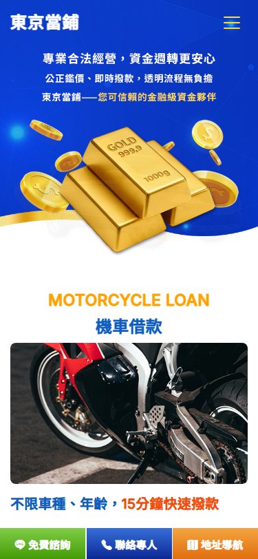 本專案為東京當舖打造的企業形象官方網站,主要用於展示金融借貸服務內容,包含汽機車借款、小額貸款與資金周轉等服務介紹。網站採用 Laravel 作為後端框架,搭配 jQuery 與 Bootstrap 建構前端介面,並實作完整的 RWD 響應式設計,使網站在桌面與行動裝置上皆能提供流暢且一致的瀏覽體驗。透過清晰的資訊架構與借款流程說明,協助使用者快速了解服務內容並取得聯絡資訊。