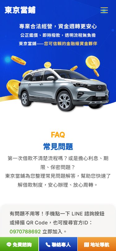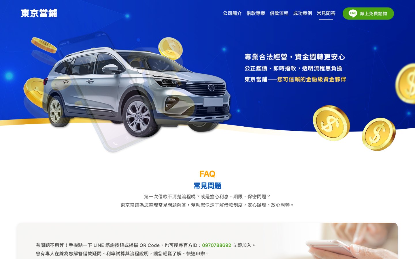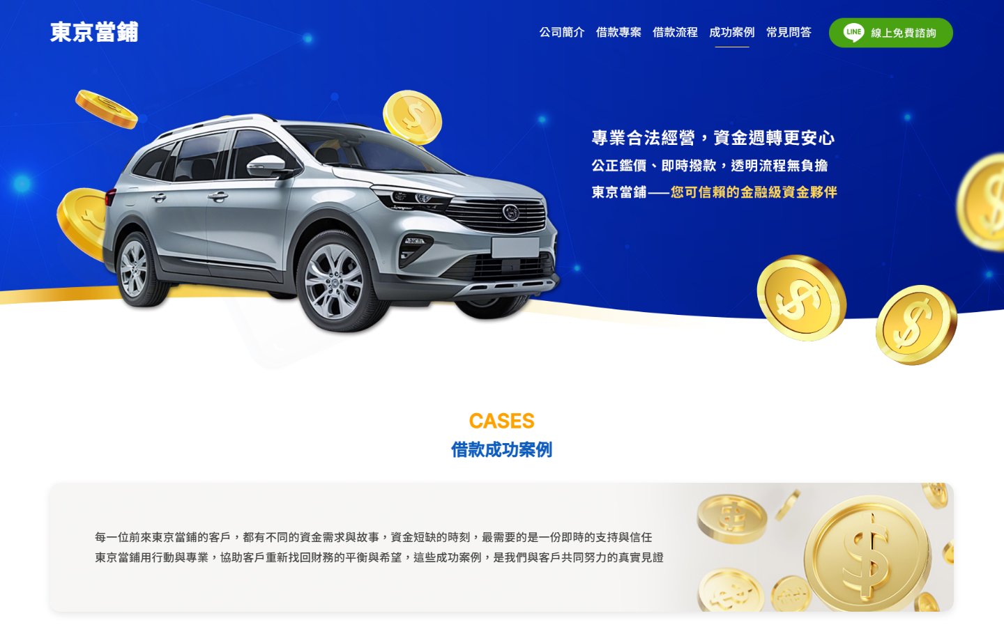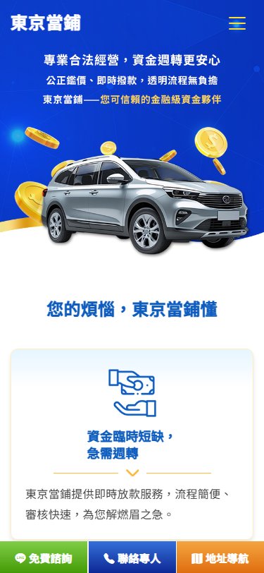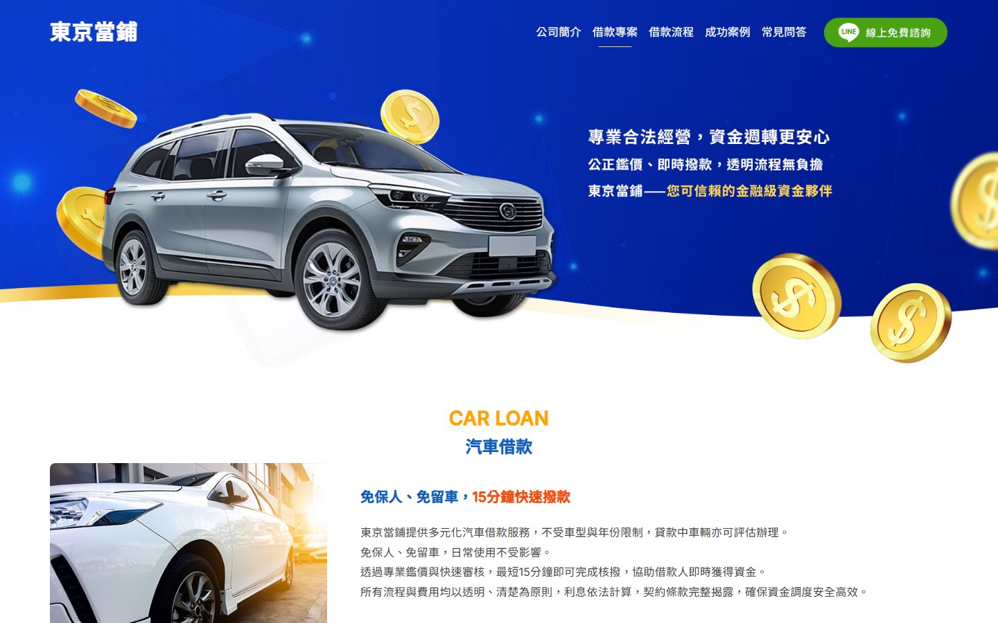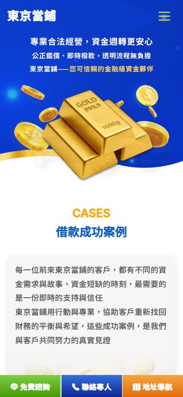 本專案為東京當舖打造的企業形象官方網站,主要用於展示金融借貸服務內容,包含汽機車借款、小額貸款與資金周轉等服務介紹。網站採用 Laravel 作為後端框架,搭配 jQuery 與 Bootstrap 建構前端介面,並實作完整的 RWD 響應式設計,使網站在桌面與行動裝置上皆能提供流暢且一致的瀏覽體驗。透過清晰的資訊架構與借款流程說明,協助使用者快速了解服務內容並取得聯絡資訊。