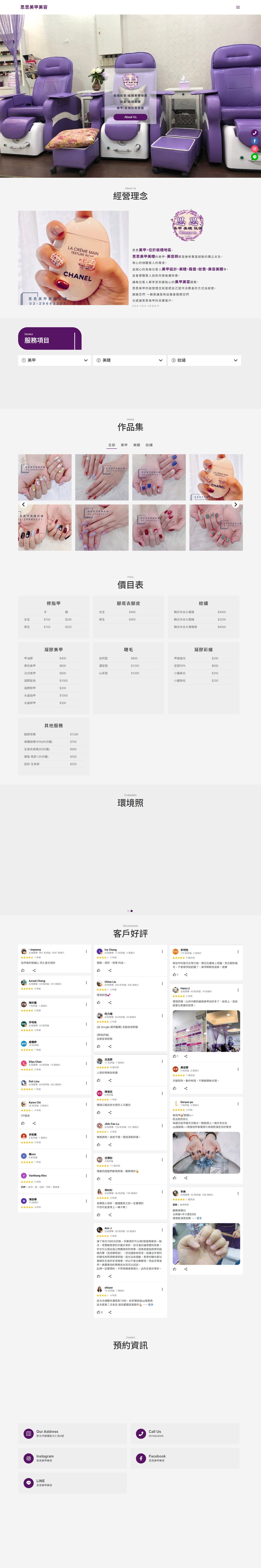 以「一站式美學服務」為核心定位,整合美甲、紋繡與美容護理服務,透過作品展示與風格呈現,建立專業且多元的品牌印象,使顧客在瀏覽過程中提升信任並增加預約意願。