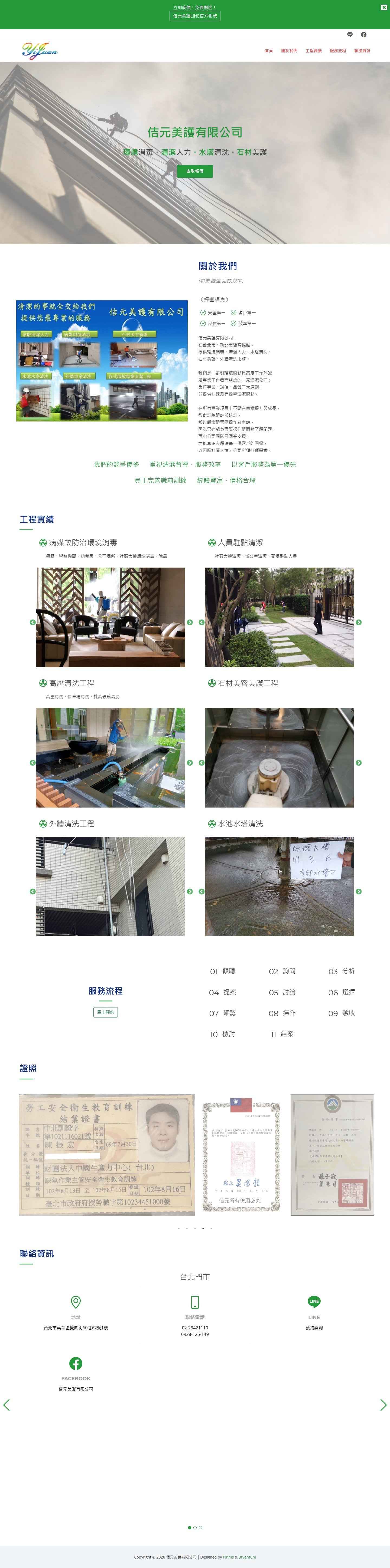 本案為「佶元美護有限公司」打造專業清潔服務形象網站,透過清爽簡潔的視覺設計與版面規劃,強化品牌專業度與服務信任感。