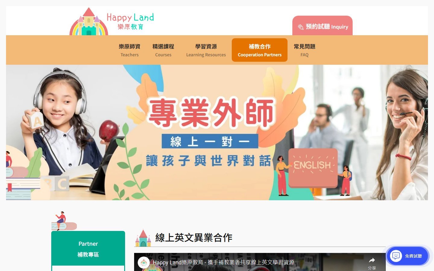 專案內容: 本案為「Happy Land 樂原教育」打造線上英語學習平台,透過活潑親和的視覺設計與清晰的內容架構,強化品牌親和力與家長信任感,提升整體平台形象。